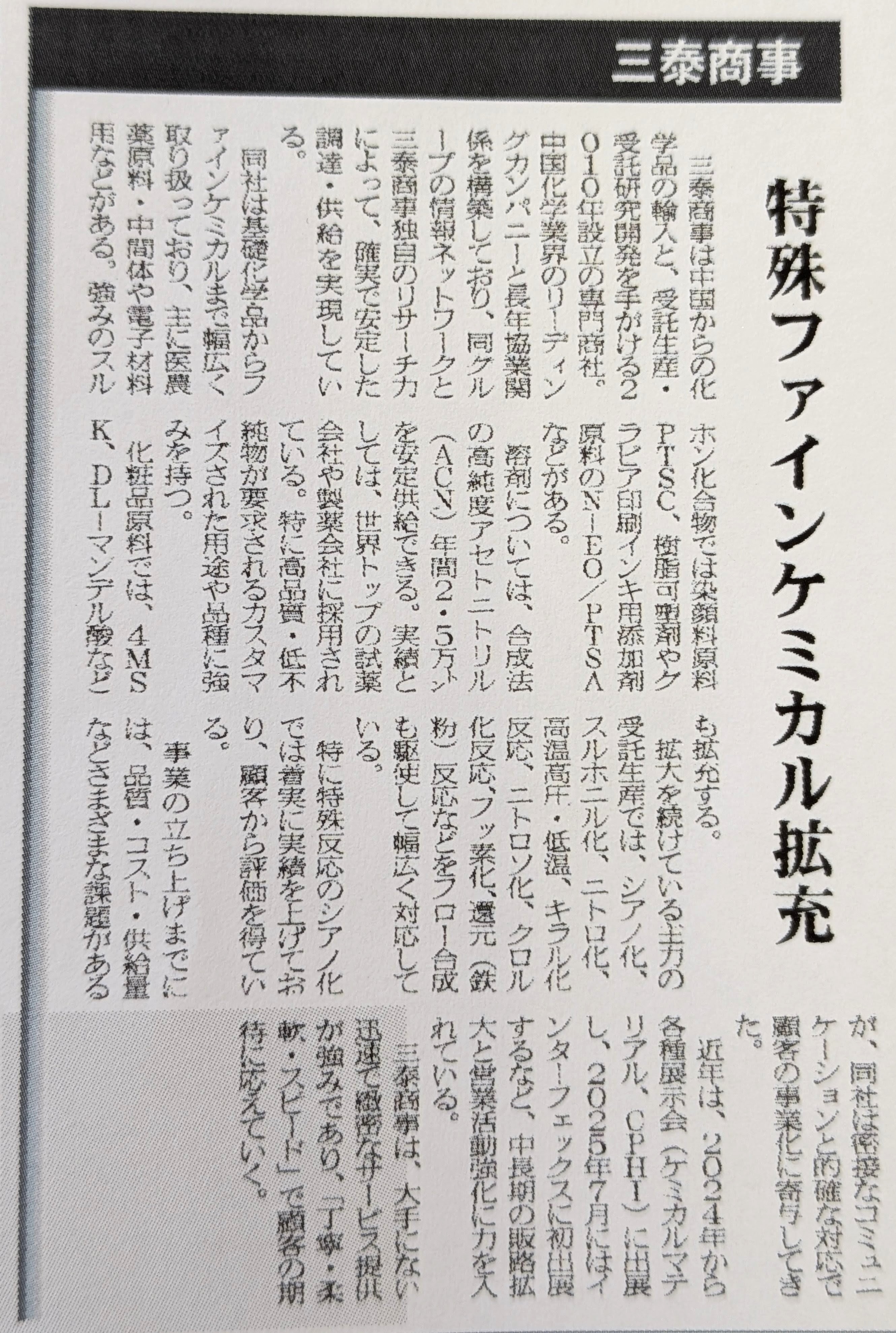 2025年7月7日(月)付 化学工業日報に、『成長活路見出いだす化学品商社特集』に当社記事が掲載されました!