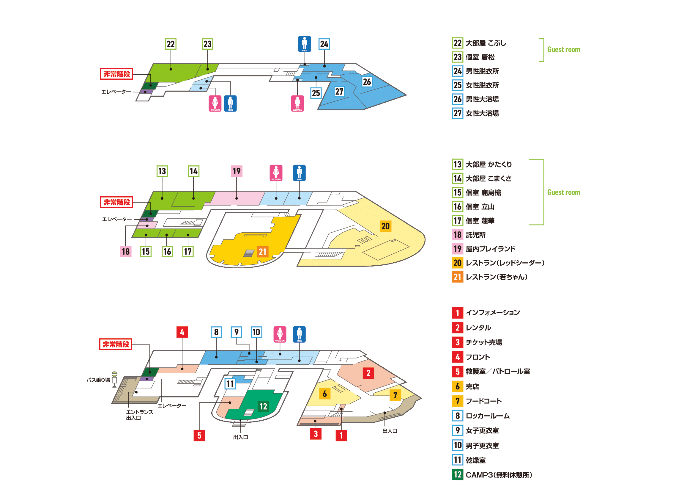 | 入浴時間 | 6:00~9:00/15:00-23:00 (最終入場22:30) 日帰り12:00~17:00(最終入場16:30) |